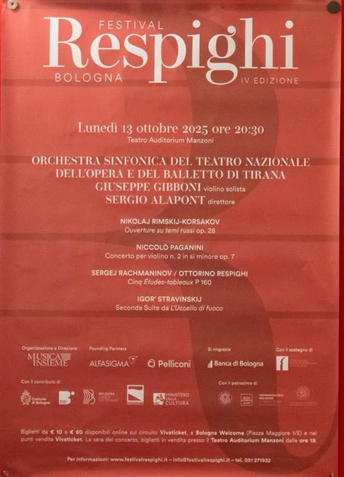 Bologna,Lunedì 13 ottobre 2025 alle ore 20:30 in ambito IVa Edizione del Festival Respighi, al Teatro Auditorium Manzoni concerto dell’Orchestra Sinfonica del Teatro Nazionale dell’Opera e del Balletto di Tirana (Albania), Giuseppe Gibboni violino solista, direttore Sergio Alapont .